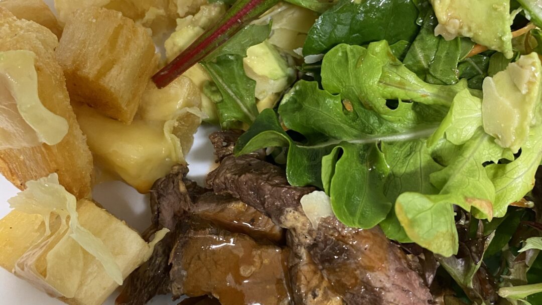 Take Away Brazilian Style BBQ with Cassava Chips and Salad. Food Inspiration.